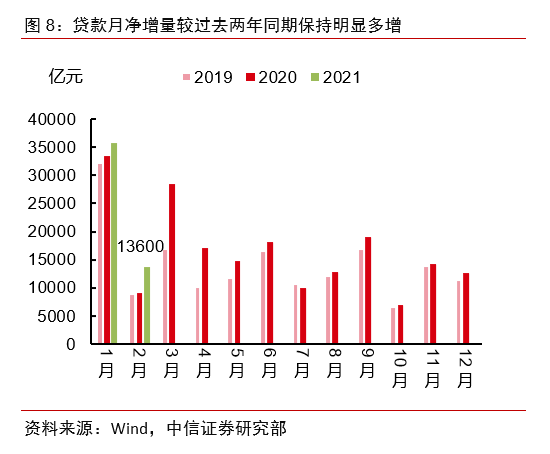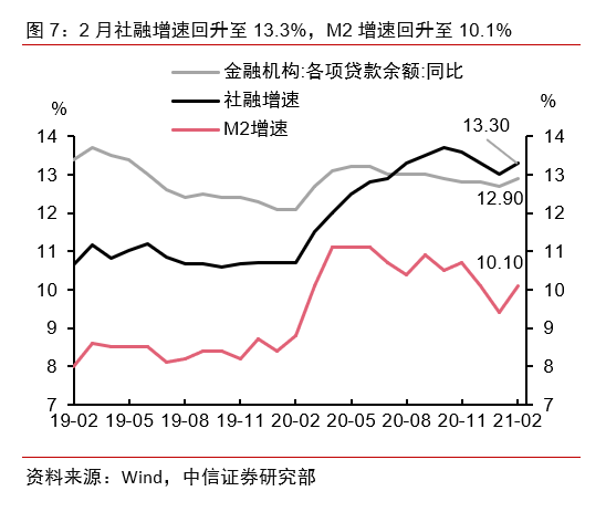 需要强调的是,社融、M2在2月出现超预期反弹,这并不意味着广义流动性会再次趋势性扩张。数据读数的超预期,既有基本面较好的因素,也有很强的节奏问题。我们在《信贷需求强劲之外,还需要关注节奏问题——2021年2月金融数据点评》(20210310)中指出,“受去年同比较高的信用债和政府债融资水平因素影响,以及去年3月再贷款再贴现政策对同期银行信贷的明显拉动,我们预计今年3月的社融将难以延续这一短暂的回升态势,预计同比增速将回落至13%以下,全年稳步回落态势不变”。