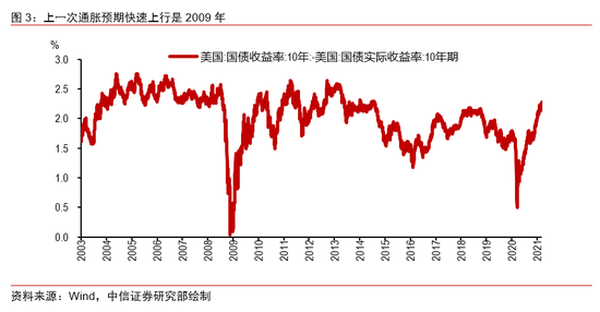 如果以美债名义收益率与实际收益率之差来衡量通胀预期的话,我们看到,市场已经给出了较强的通胀预期。如此的通胀预期快速上行上一次还是发生在2009年。2009年也是危机之后的恢复期。但是,虽然彼时通胀预期快速上行,但之后却逐渐进入了一个全球低通胀时代。只是在2011年全球油价大幅上行的时期,全球出现了通胀风险。但与那时不太可比的是,2011年发生了中东北非事件,对原油供给产生比较明显的冲击。