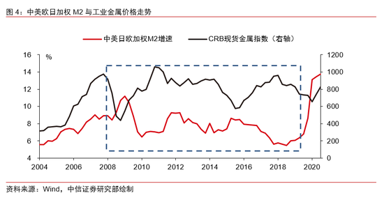 在我们发布《宏观经济专题报告——宏观视角:工业金属涨价知多少,何时了?》(20210309)中,我们提出供需基本面、美元汇率和宏观流动性是决定工业金属价格的三大原因,但汇率和宏观流动性实际上是基本面表现的一种映射,因此经济增长下的供需边际变化为影响价格的核心因素。在历史分析中,我们发现,如果将中国、美国、欧洲和日本四国的M2增速进行加权,近似等同于全球广义流动性的变化,其与大宗商品价格走势并不同步,甚至具有一定的反向关系。理论上这也可以用凯恩斯主义的“流动性陷阱”去解释,随着全球进入低利率甚至零利率时代,货币宽松对实体经济的拉动效果越来越低。因此,我们认为单纯基于流动性过剩来推断大宗商品长期走强的逻辑应该谨慎对待。当前大宗商品价格走势的分析还是基于供需变化。