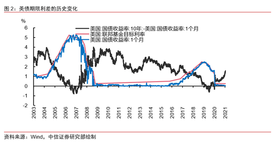 预计美债收益率今年高点在1.7-1.8%左右,突破2%的难度较大。目前美联储的核心目标可能仍聚焦在经济恢复上,即便出现了通胀读数暂时性的上行,也预计将等待平均通胀水平实质性超过2%之后再采取“右侧操作”。考虑到美联储如果推出宽松的货币政策,也大体会遵循“减缓扩表——缩表——加息”的路径,因此可能两年之内加息的可能性都不大。如此一来,美债市场中的最短端利率基本是稳定的。在期限利差非常大的时候,一方面可能触发OT、YCC操作,另一方面,市场自发的均衡作用就可能让利差水平回到均衡。如果回顾历史来说,只有美联储开启快速降息(短端利率较快下行)的时候,才是美债利差扩张比较明显的时候,而在短端利率维持不动的时期,更多的趋势性还体现为期限利差的缩小。