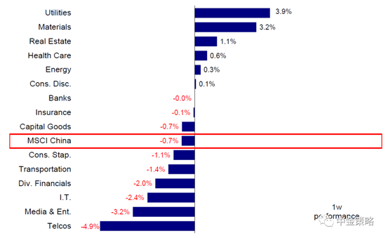 市场回顾:虽然海外中资股市场上周前几天有所企稳反弹,但周五受美债收益率飙升影响再度承压,进而导致全周收跌。整体来看,MSCI中国指数小幅走低0.7%,恒生指数和恒生国企指数分别下跌1.2%和1.1%,但成长股居多的恒生科技指数则大跌2.1%。行业层面,风格轮动较为明显,电信板块领跌4.9%,其次是媒体&娱乐(-3.2%)和信息技术(-2.4%)。相反,公用事业、材料、地产板块领涨,分别上涨3.9%,3.2%和1.1%。