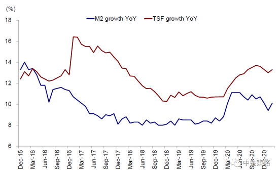 另一方面,2月PPI冲高至1.7%,但可能不会成为紧货币的理由。通胀快速上涨主要反映了全球大宗商品价格受疫苗接种驱动经济复苏预期。考虑全球大宗商品价格上行,我们预计短期PPI上行压力仍将持续。但是,领先PPI增速约6个月的M1-M2剪刀差指标上月大幅收窄,显示未来PPI可能逐步见顶回落。此外,CPI同比增速较去年同期下滑0.2百分点,小幅高于1月份的-0.3%。