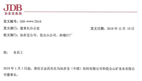 3月份,时任加多宝旗下昆仑山矿泉水有限公司负责人的李春林被任命为加多宝集团总裁。