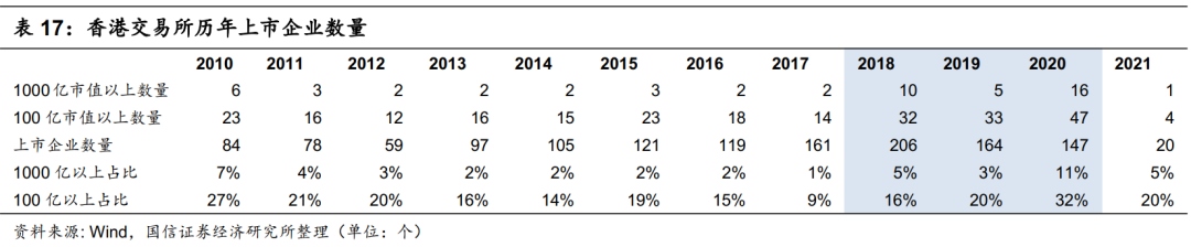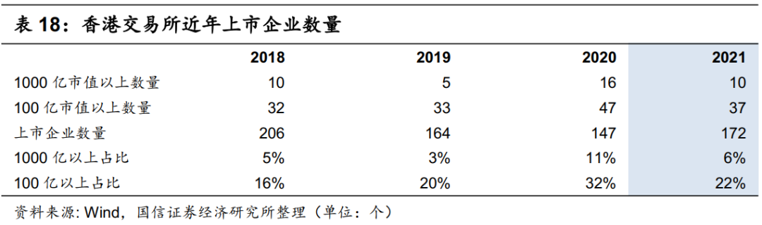 自2018年以来,香港交易所集团的上市企业结构在迅速改善,即市值100亿港元以上和市值1000亿港元以上的企业数量在迅速提升。