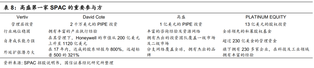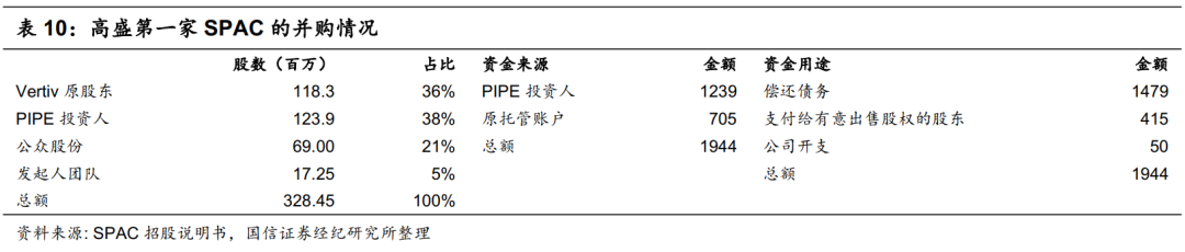 高盛第一家SPAC的简介:高盛在2018年6月设立了旗下的第一家SPAC,GS Acquisition Holdings Corp I,通过IPO融资6.9亿美元,并在2020年2月成功并购一家数据设备服务商(“Vertiv”),在并购过程中成功引入了一笔12.3亿美元的PIPE(Private Investment in Public Equity,上市公司私募融资,SPAC历史上第三大规模的PIPE),将Vertiv的企业价值(Enterprise Value)评估为53亿美元。在并购完成后的第一个交易日,该SPAC的投资者获得了42%的投资收益。