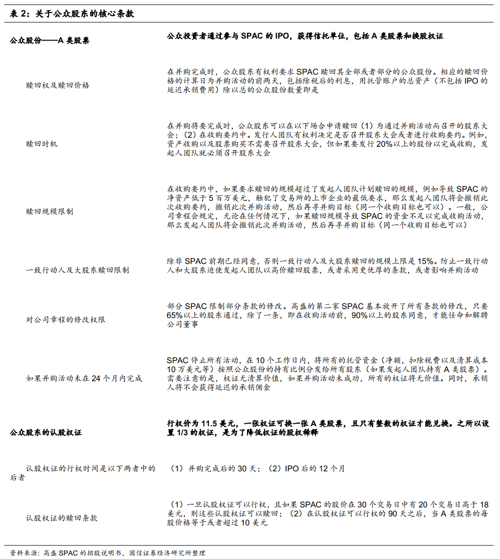 权力:在并购活动完成之前,发起人团队对董事会拥有绝对的话语权,可独立任命董事,无需征求股东同意,并且股权占比(20%)不得被稀释,同时在推进并购决策的时候,只需要少部分公众股东(至少37.5%)的同意就可以。