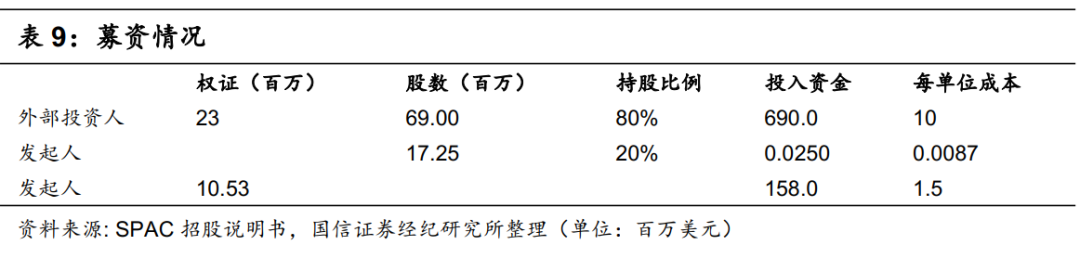激励:发起人在SPAC的IPO之前就以极低的价格获得了一定的股份(B类,一般是几万美金获得总股份的20%)和换股权证(以私募形式购买,每张1.5美元)。