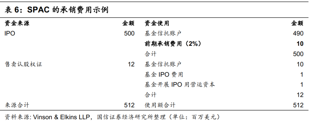 如果仅仅是提供承销服务,SPAC与传统IPO的承销佣金结构基本一致。在传统的IPO中,投资银行可以在IPO结束后获得募集金额的5%-7%,作为承销佣金,而在SPAC中,承销商先获得募集金额的2%,然后其余的3.5%被锁定在信托账户中,待找到收购标的并完成收购后,承销商才能获得这个3.5%的佣金,但如果没有完成收购,便没有这3.5%的佣金。