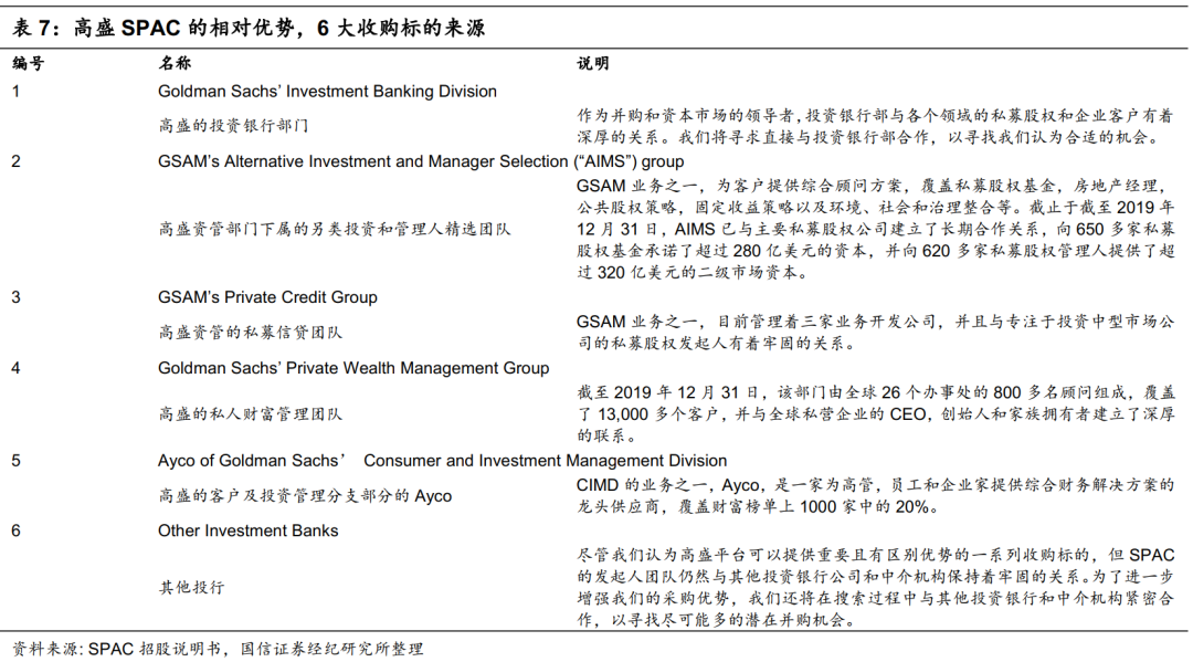 高盛在为旗下SPAC做宣传的时候,宣传重点就在于高盛拥有广泛的交易标的网络,主要有6大标的来源,如下表所示,能够获得丰富且优质的收购标的。