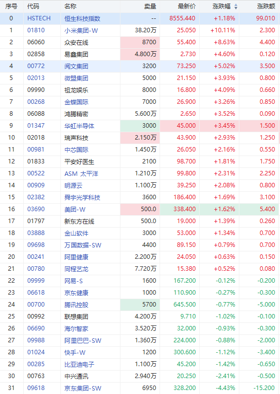 截至发稿,小米涨超10%,众安在线涨超8%市值重返800亿港元,微盟涨超3%,芯片股走高,华虹半导体涨超3%,中芯国际、ASM太平洋涨超2%。