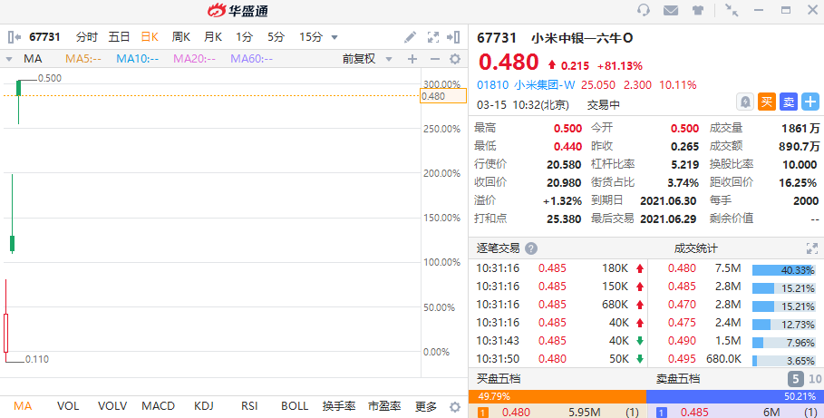 华盛资讯3月15日消息,美国法院暂停将公司认定为中国涉军企业的行政命令,近期最大利空短暂消除,小米今日跳空高开,盘中大涨逾10%,股价重新站上25港元,市值超过6300亿,其牛证成倍跟涨。截至发稿,小米中银—六牛O暴涨超80%,其行使价为20.58港元,2021年6月30日到期,杠杆比率5.219倍,距收回价有16.25%的收回距离。小米国君—八购A现亦涨超50%,行使价为33.83港元,溢价40.88%,实际杠杆3.717倍,21年8月3日到期。