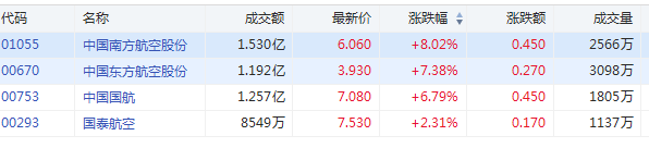 港股航空股持续拉升,中国南方航空涨超8%,东方航空涨超7%,中国国航涨超6%。
