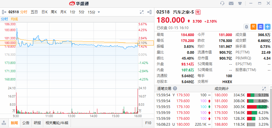 华盛资讯3月15日讯,汽车之家(02518.HK)首挂高开2.6%,收盘报价180.00港元,较发行价176.30港元上涨2.10%,一手账面盈利370港元。该股最新总市值908.7亿港元,成交额6.668亿港元。
