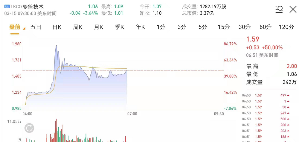 箩筐技术(LKCO)盘前一度大涨超80%。截至发稿,该股现涨50%,报1.59美元。