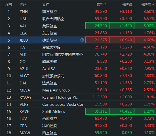 受利好数据的刺激,美股航空板块盘中全面走强。至发稿时止,南航ADR涨8.60%,美联航涨6.57%,美国航空上涨6.08%。