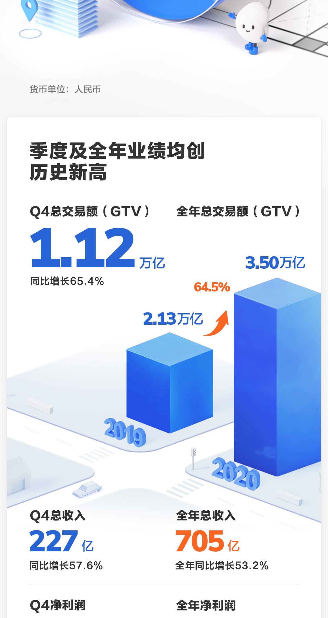 - 从全年来看,贝壳2020年营业收入为人民币705亿元,同比增长53.2%;净利润达人民币27.78亿元,首次实现美国通用会计准则(USGAAP)下全年盈利;经调整后净利润达人民币57.20亿元,同比大增245.4%。