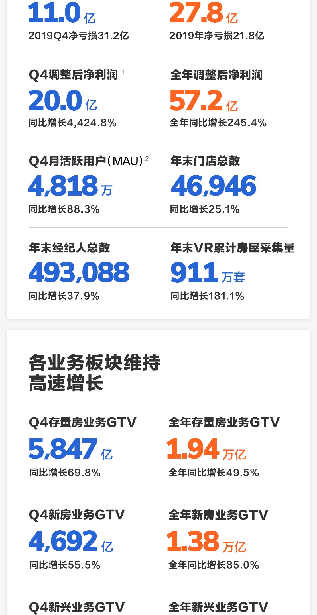 - 财报数据显示,贝壳2020年第四季度营业收入为人民币227亿元,同比增长57.6%;净利润为人民币10.96亿元;经调整后净利润为人民币20.01亿元,同比增长4,424.8%。