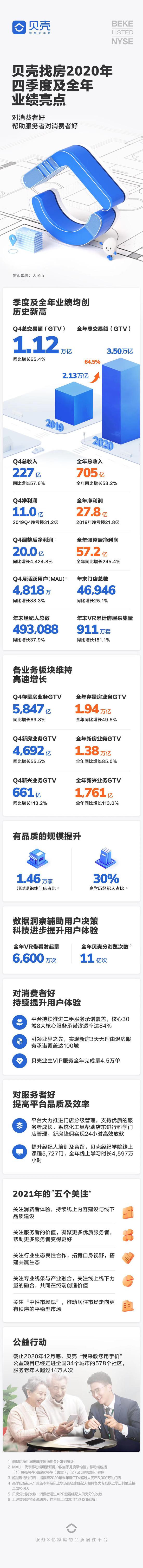 北京时间3月16日,贝壳(NYSE:BEKE)发布截至2020年12月31日的未经审计的第四季度和全年财务业绩。财报数据显示,贝壳2020年第四季度营业收入为人民币227亿元,同比增长57.6%;净利润为人民币10.96亿元;经调整后净利润为人民币20.01亿元,同比增长4,424.8%。从全年来看,贝壳2020年营业收入为人民币705亿元,同比增长53.2%;净利润达人民币27.78亿元,首次实现美国通用会计准则(USGAAP)下全年盈利;经调整后净利润达人民币57.20亿元,同比大增245.4%。