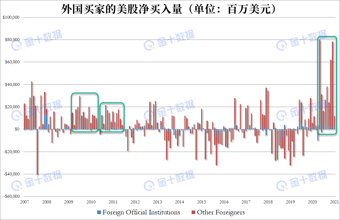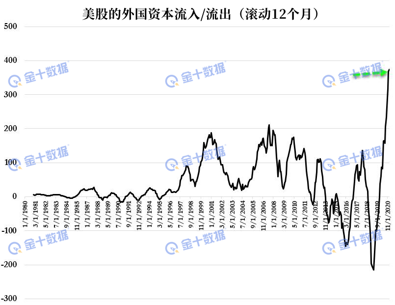过去12个月里共有3750亿美元的资金流入美股,这是外国人有史以来最大的美国股票购买量。