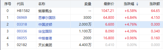 华盛资讯3月16日消息,港股烟草概念早盘集体走强,思摩尔国际大涨6%,中国波顿涨近5%,华宝国际涨超4%。