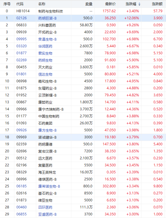 华盛资讯3月16日消息,生物制药板块盘中涨幅扩大,成分股集体上涨。截至发稿,药明巨诺涨超12%,开拓药业涨超9%,荣昌生物、君实生物涨超6%,药明生物、信达生物涨超5%,中生制药、康方生物、康希诺生物涨超3%。