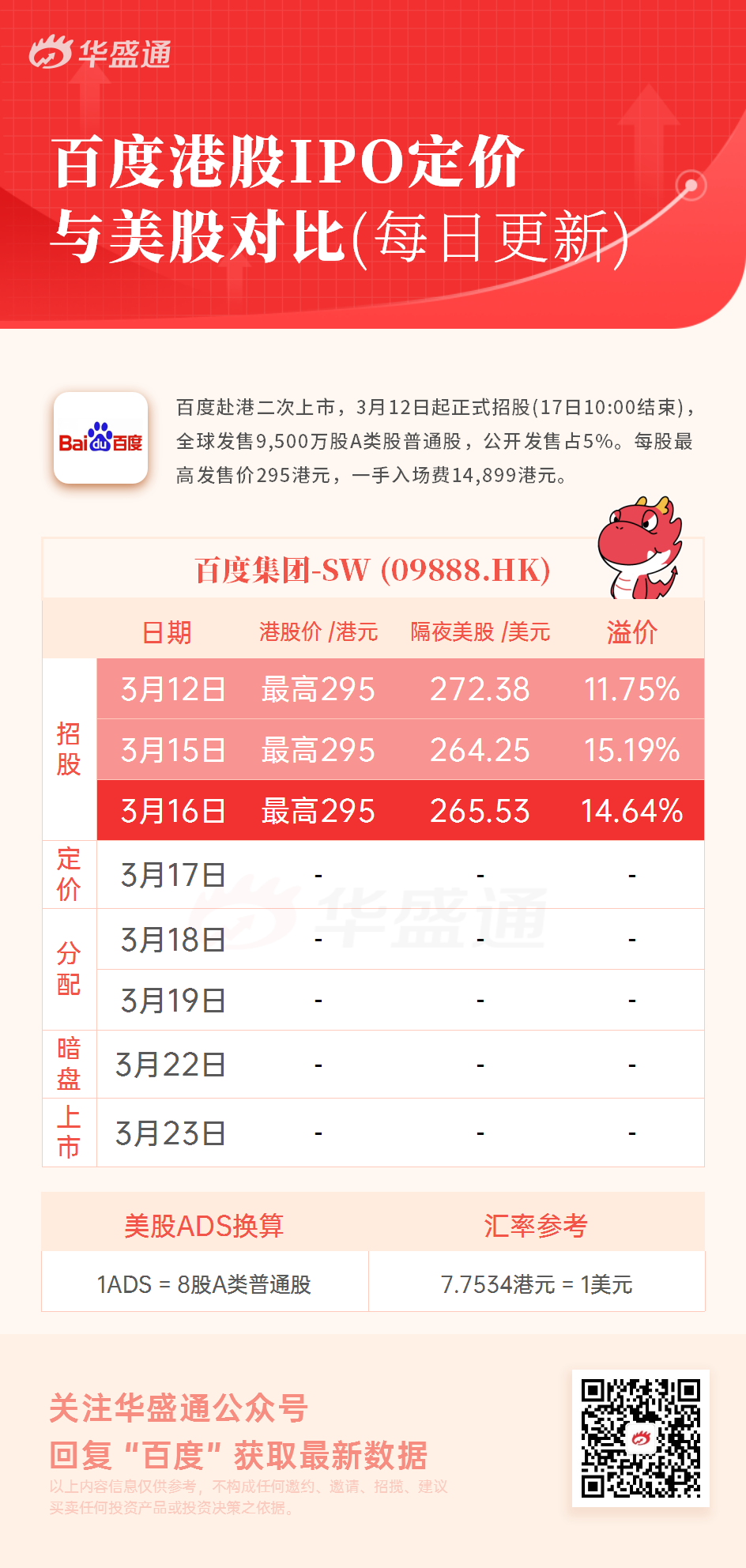 按发行价上限295港元计,百度集团-SW港股价较隔夜美股(265.53美元)溢价14.64%。