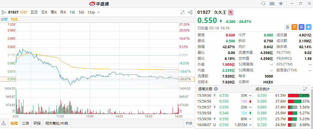 华盛资讯3月16日讯,甜食产品制造商久久王(01927.HK)首挂全日震荡,换手率达62.14%,收盘报价0.550港元,较发行价0.750港元下跌26.67%,一手账面亏损1000港元。该股收盘成交额3.159亿港元,振幅42.67%,最新总市值4.356亿港元。