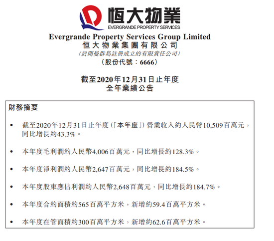 3月16日消息,恒大物业在港交所公告称,2020年营收约105.09亿元,同比增长约43.3%;股东应占利润约26.48亿元,同比增长约184.7%。