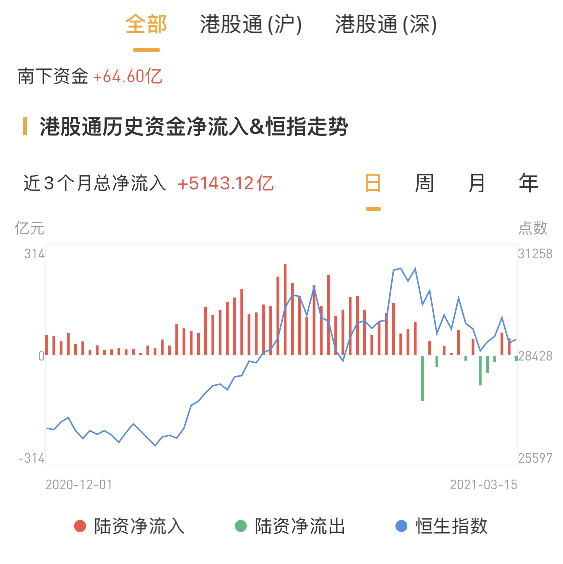 南下资金今日净流入港股64.6亿港元,周一净流出超15亿港元。
