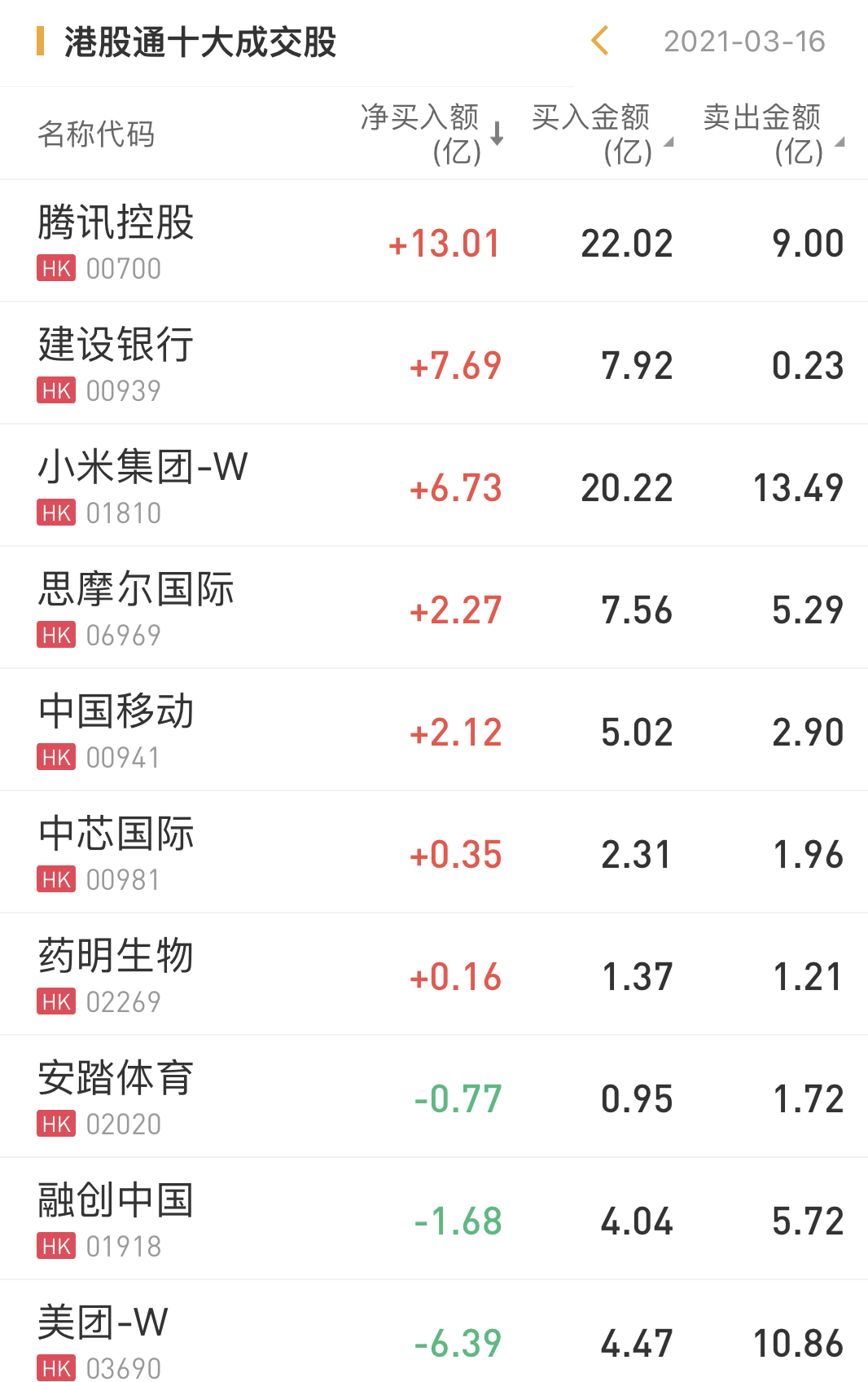 个股方面,今日南下资金净买入腾讯控股13.01亿港元,为今日买入之最。此外,南下资金还扫货小米6.73亿港元。
