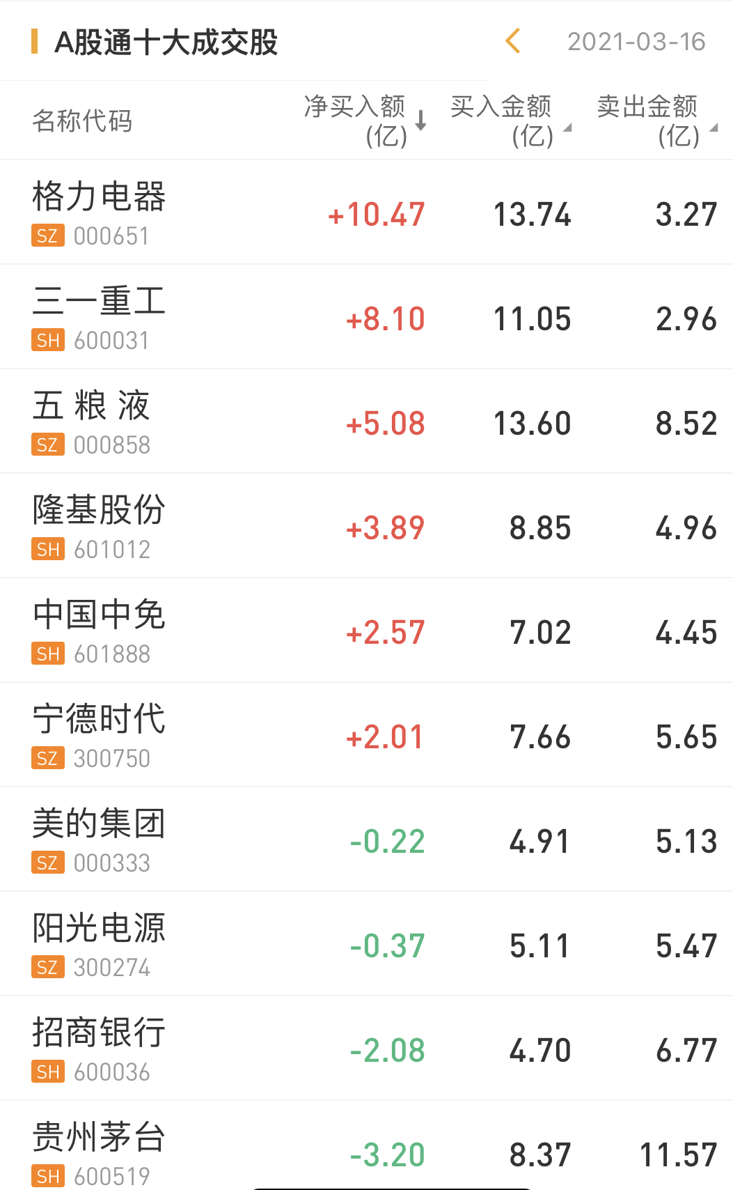 北上资金今日扫货格力电器,净买入10.47亿元,为今日买入之最,还买入三一重工8.10亿元。