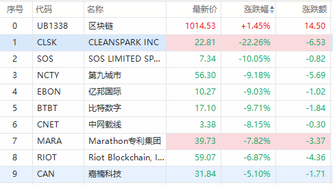 截止发稿,SOS(SOS)跌超10%,第九城市(NCTY)跌9.18%,亿邦国际(EBON)跌9.03%,嘉楠科技(CAN)跌5.10%,Riot Blockchain(RIOT)跌6.87%。