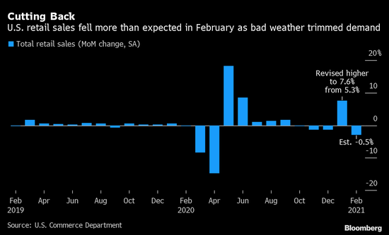 美国商务部周二公布的数据显示,2月份零售额下降3%,1月份增幅向上修正为7.6%,是七个月最大增长。彭博调查的经济学家的预测中值为2月份零售额下降0.5%