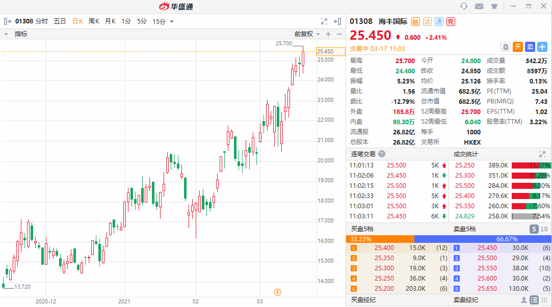 华盛资讯3月17日消息,海丰国际盘中再创历史新高,今年累计上涨超50%。截至发稿,海丰国际涨2.41%,现报25.4港元每股,暂成交8597万,当前总市值为682.5亿。