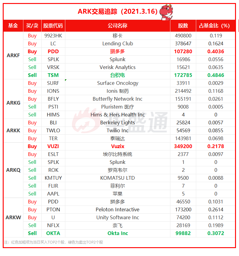 1.ARK旗下两只基金总共加仓拼多多约15.4万股,斥资约2513万美元。