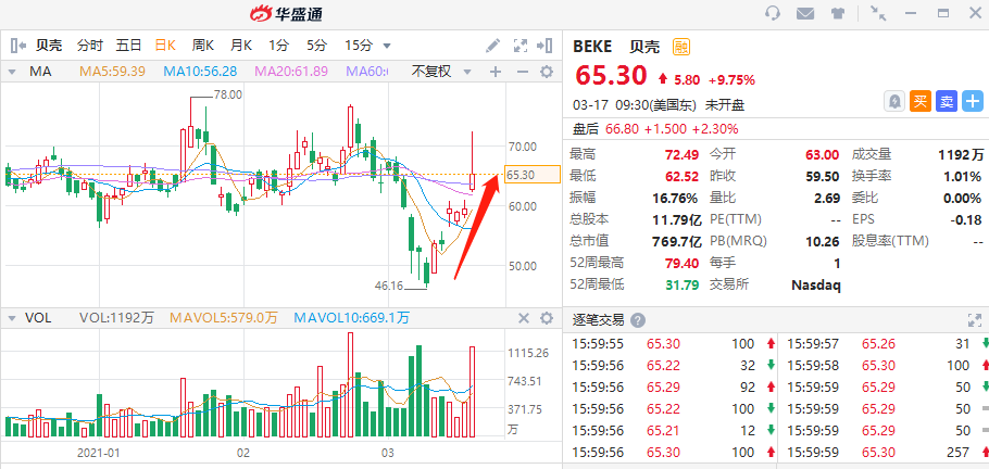 而贝壳近期的股价表现也呈现逆着弱市大涨的态势,在3月16日股价一度大涨近22%,从3月8日的股价低点46.16美元到3月16日收市价65.3美元,累计涨幅超过41%!