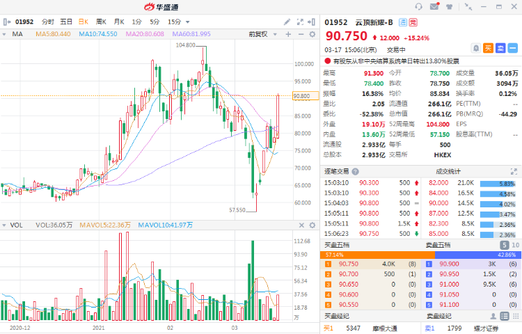 周三港股午后,生物科技公司云顶新耀 (HK:1952)大涨15%,报90.75港元,总市值升至266亿港元。该公司近6个交易日股价累计飙升40%。