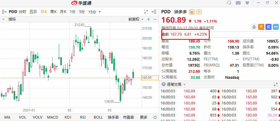华盛资讯3月17日讯,拼多多(PDD)盘前涨超4%,公司将于今日公布第三季度及全年财报。