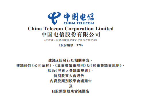 中国电信:建议首次公开发行A股股票并在上交所主板上市