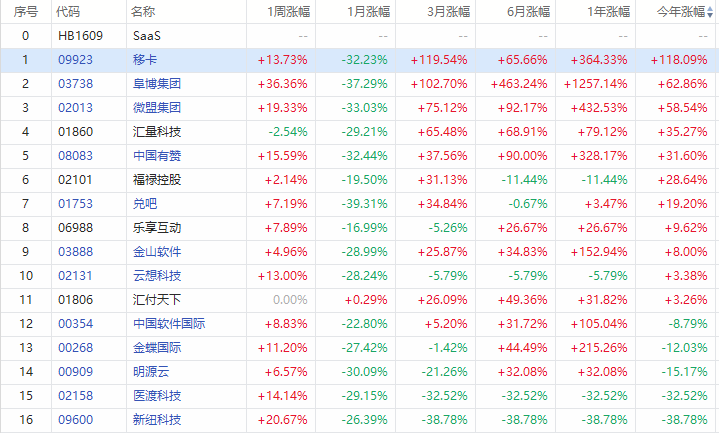 随着3月初市场行情的走跌,SaaS概念股也迎来大幅回调。阜博集团一度重挫逾60%,微盟集团股价也濒临腰斩。但近期SaaS概念股逐渐复苏回升,盘中不断走高,行业景气度依旧保持。年初至今,移卡依然暴涨近120%,阜博集团、微盟集团等皆涨超50%。