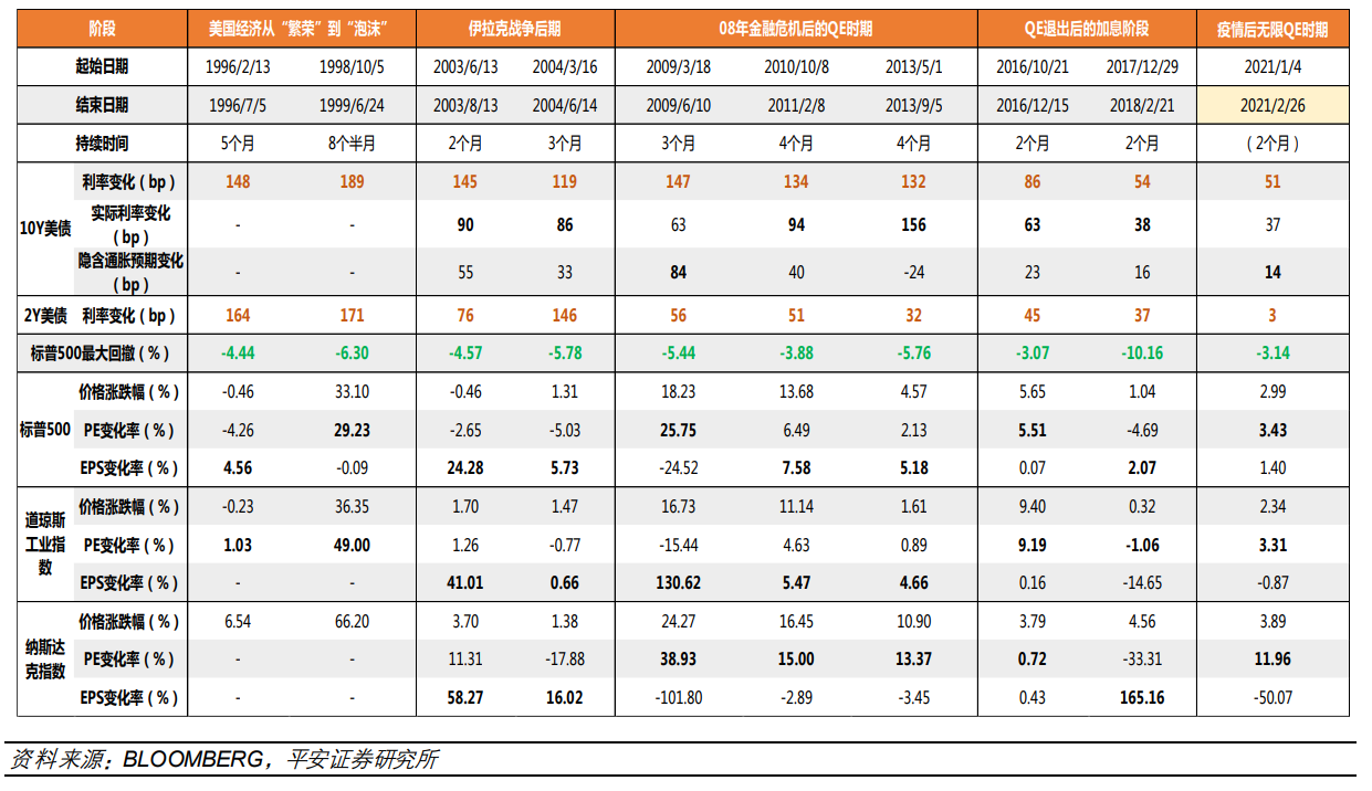 注:上图为美债利率快速上行期美股估值及盈利的变化,来源:平安证券