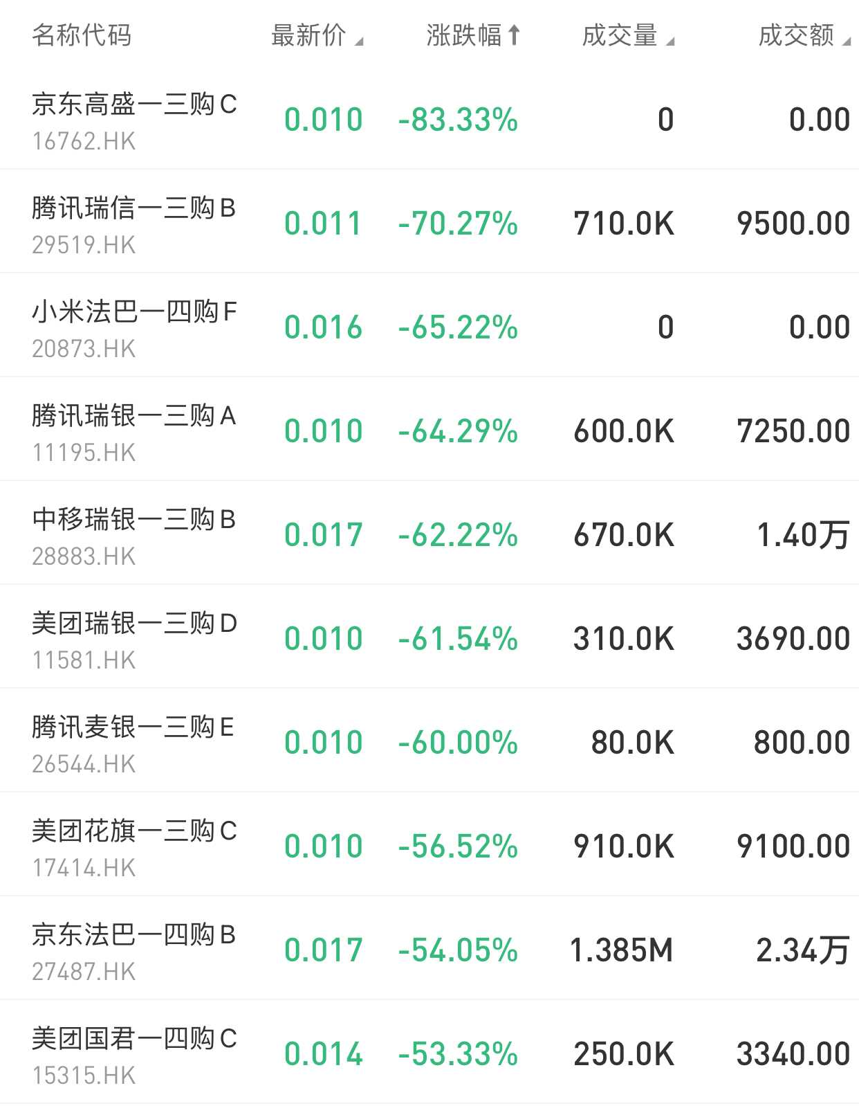 今日所有窝轮牛熊证合计成交252.25亿港元,占大市成交16.96%。