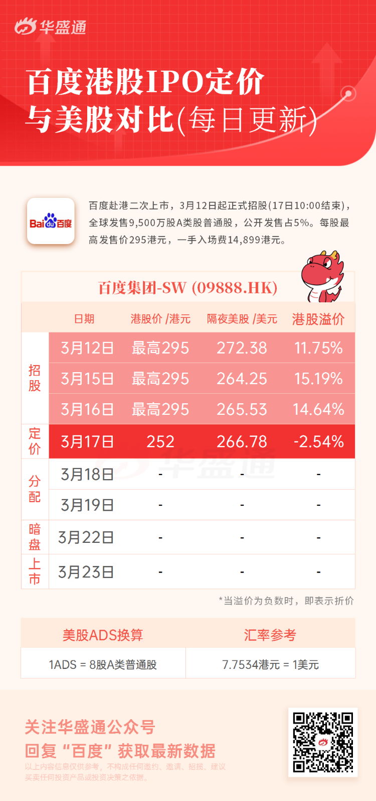 3月17日消息,百度集团在港交所公告,国际发售与香港公开发售的最终发售价均已确定为每股发售股份252.00港元,本公司A类普通股预期将于2021年3月23日在香港联交所主板以股票代号‘9888’开始交易。