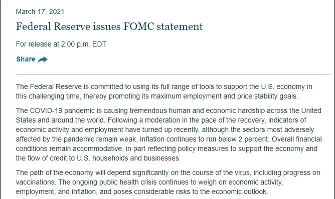 美东时间周三,美联储公布最新的3月利率决议,美联储维持利率0-0.25%不变,符合预期,预计在2023年之前不会加息。联储主席鲍威尔讲话期间,美债收益率回落,黄金、比特币拉涨,截至收盘,美国三大股指全线上涨,道指和标普500指数续创历史新高,道指涨近200点首次升破33000点,标普500指数涨0.29%,纳指涨0.4%。