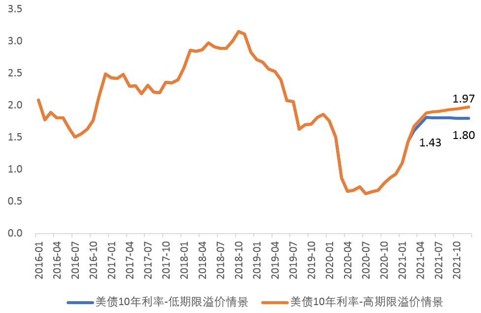 实际上10年期美债收益率在3月5日升至1.5%-1.6%,上升速度超出了我们当时预期。目前来看,利率上行的时间和空间尚不充分,年内上升空间预计仍有20-30基点,5月后运行区间将位于1.5%-1.8%(低期限溢价情形)。但是利率回升最快的阶段可能已经经历,后续上升斜率将放缓,震荡将加大。