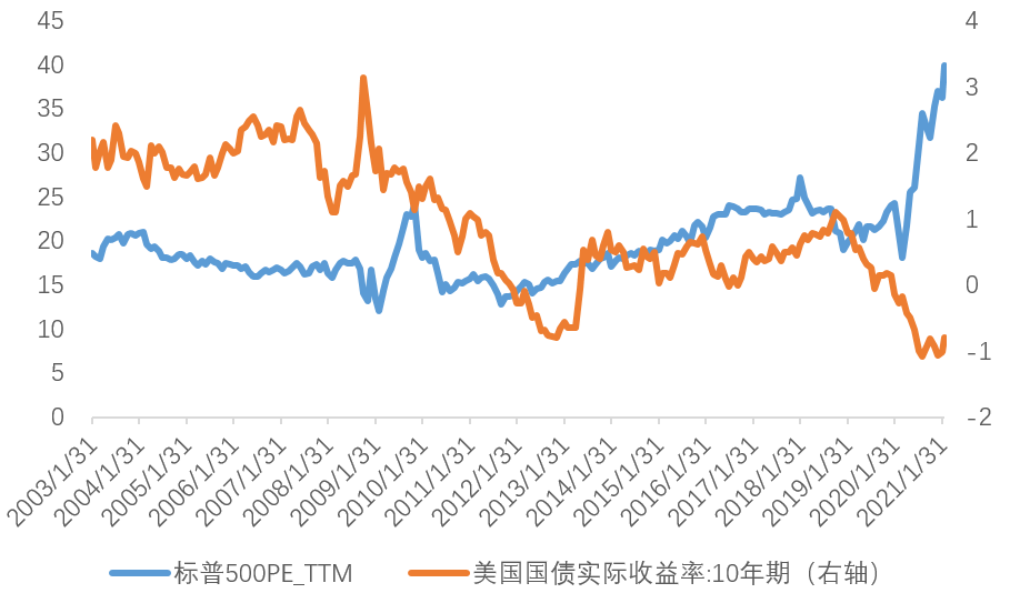 图6:美股估值水平时间序列及10年期国债实际利率,资料来源:Bloomberg,天风证券研究所