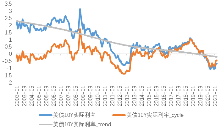 从以上两方面来看,实际利率的回升还会继续。在经济复苏的斜率和美联储对于利率回升的态度没有发生变化之前,实际利率回升的趋势不会改变。但如果把时间拉长到过去20年,实际利率的长期趋势是向下的。2008年之前,实际利率的水平是2%;而2008年之后,实际利率长期位于0%-1%之间;疫情前,实际利率已经在0%附近。