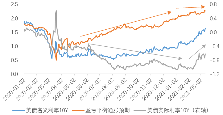 2月以来,10年期美债收益率从1.0%-1.1%上行到1.5%-1.6%,1个半月(2月-3月中)的上升幅度(约50个基点)相当于之前6个月(去年8月-今年1月)的总和。实际利率的上升起了主要作用:2月以来10年期美债实际利率上升了40基点,而(盈亏平衡)通胀预期只上升了13基点,维持在2.2%附近。