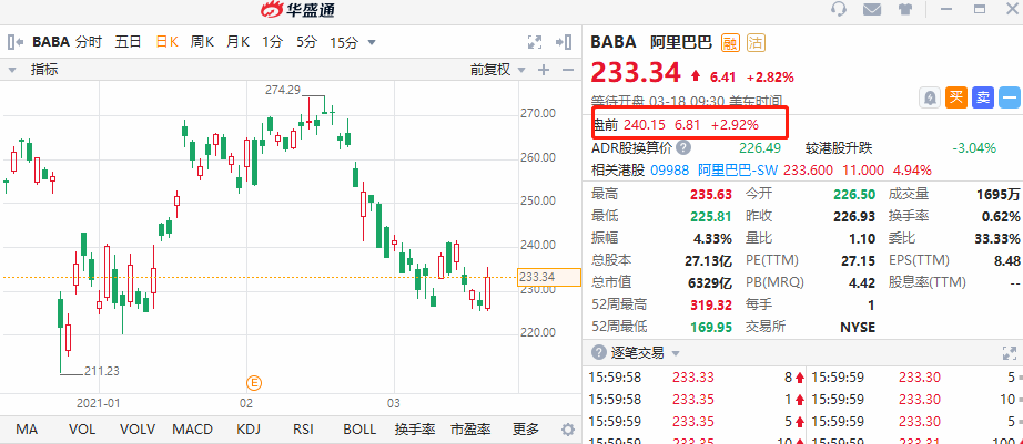 阿里巴巴(BABA)盘前涨近3%,今日港股一度涨近7%。