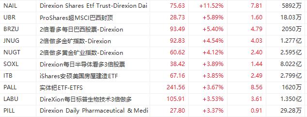 美股周三收高,道指史上首次站上33000关口,与标普指数均创历史新高。美联储维持利率不变,上调GDP与通胀预期。从ETF涨幅榜来看,涨幅居前主要有房间建筑型NAIL的ETF,涨11.52%,成交额5892万美元;2倍做多金矿指数涨4.54%,成交额1.28亿美元。